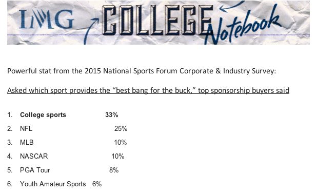 #ChaChing: College sports considered "best bang for the buck" by top sponsorship buyers. (h/t@IMGCollege)pic.twitter.com/RI8r2LPt9Y