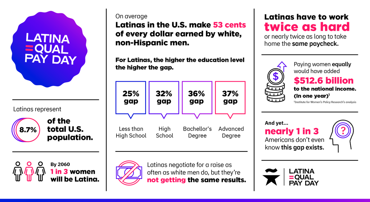 October 29th is #LatinaEqualPayDay, celebrated this day as it represents how far into the year Latina women on average must work to earn what white non-Hispanic men doing substantially the same work earned in the previous year. Take a look at this data and help us share!pic.twitter.com/IVRDOk3srY