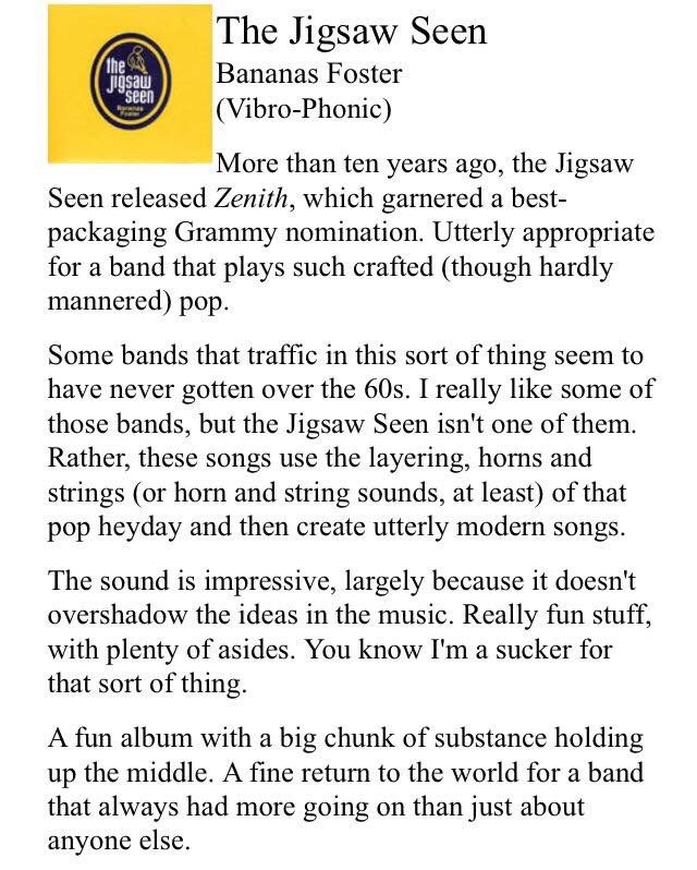 Underground culture website Aiding & Abetting reviewed The Jigsaw Seen's "Bananas Foster", calling it "a fine return for a band that always had more going on than just about anyone else."pic.twitter.com/lUl7gyPmaH