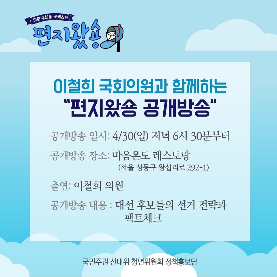 #편지왔숑 공개방송 녹화 - 4월 30(일) 저녁 6시 반 ~ 8시 20분 - 마음온도 레스토랑(서울 성동구 왕십리로 292-1) - 출연 : 이철희 의원 - 공개방송 주제 :#대선 후보들의 선거 전략과#팩트체크pic.twitter.com/AlBNe7z1lh