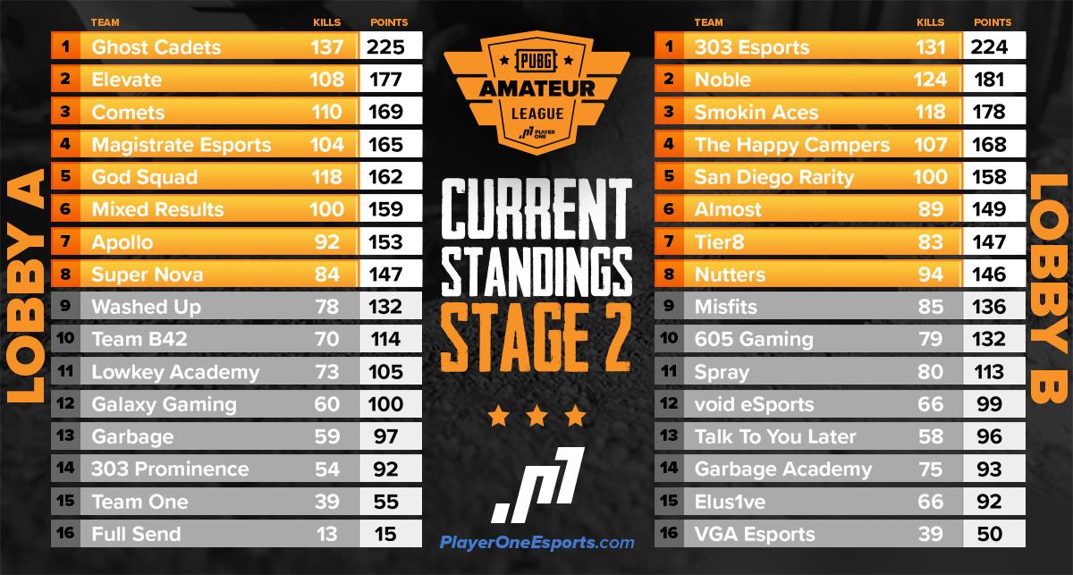 Congratulations to the Top 16 Teams (Top 8 from each Lobby) who will advance to the Stage 2 Finals of the Player One $10,000 #PUBG Amateur League. Tune in next Thursday and Friday at 8 PM EDT / 5 PM PDT to see the epic conclusion of Stage 2. 📺: https://www.twitch.tv/playeroneesports … pic.twitter.com/CMqSXs4GBY