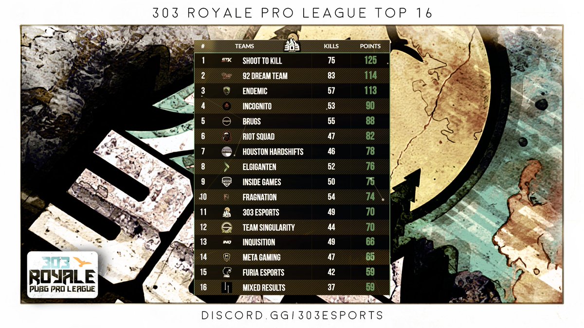 303 Royale Pro League TOP 16 @ShootToKillPUBG 92 Dream Team @endemicesports Incognito Brugs @RiotSquad Houston Hardshifts @ELGIGGAMING @InsideGamesCZ FragNation @303esports @SNG_Esports Inquisition Meta Gaming @furiagg @MixedPUBG All advance next week to the Grand Finals! GGs🧡pic.twitter.com/mPTcD5xTeg