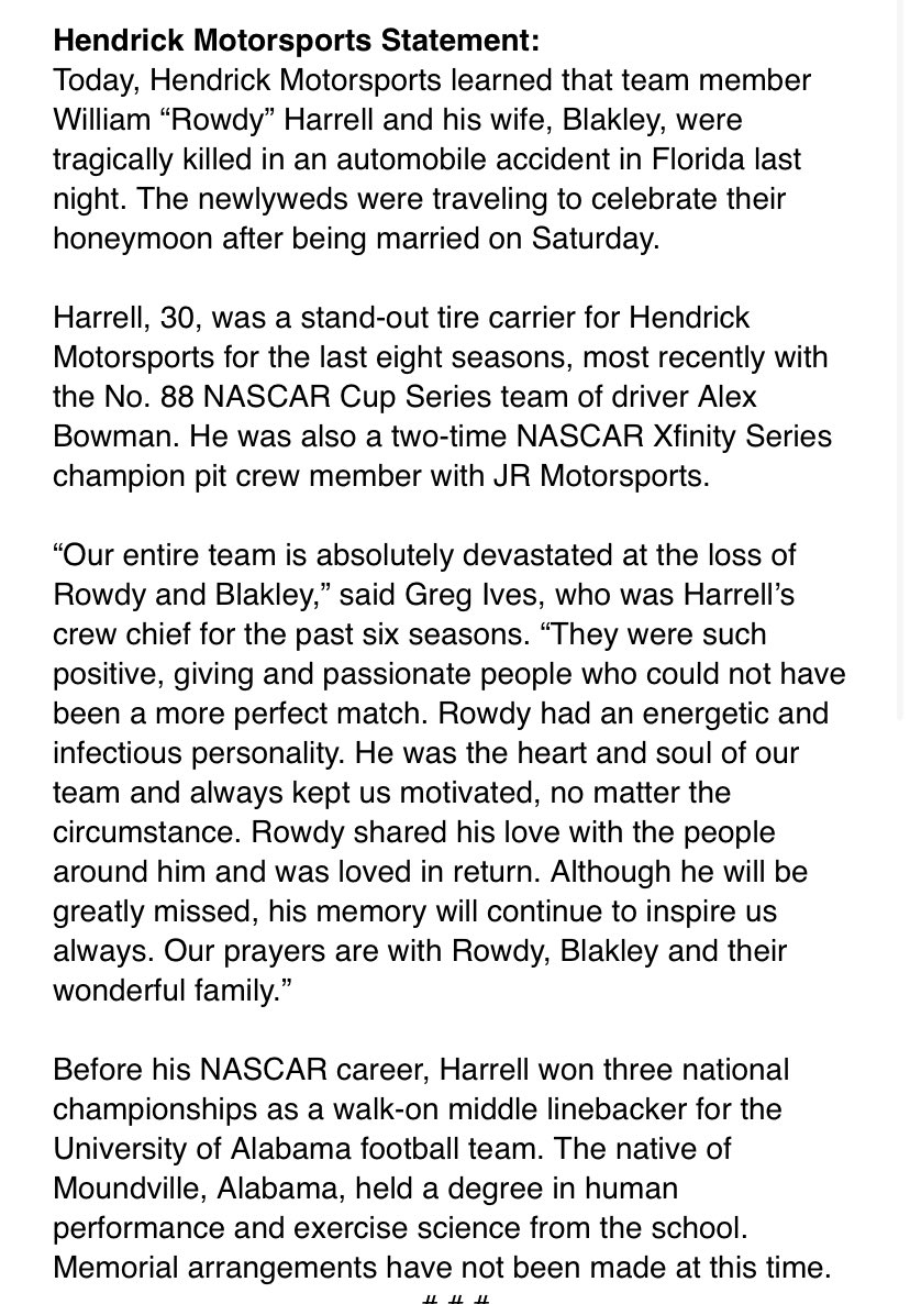 Hendrick Motorsports statement on tire carrier Rowdy Harrell and his wife, Blakey, who died last night in an automobile accident. Thoughts are with his teammates and family and all those involved in the accident. RIP.pic.twitter.com/ss6FNtIx02