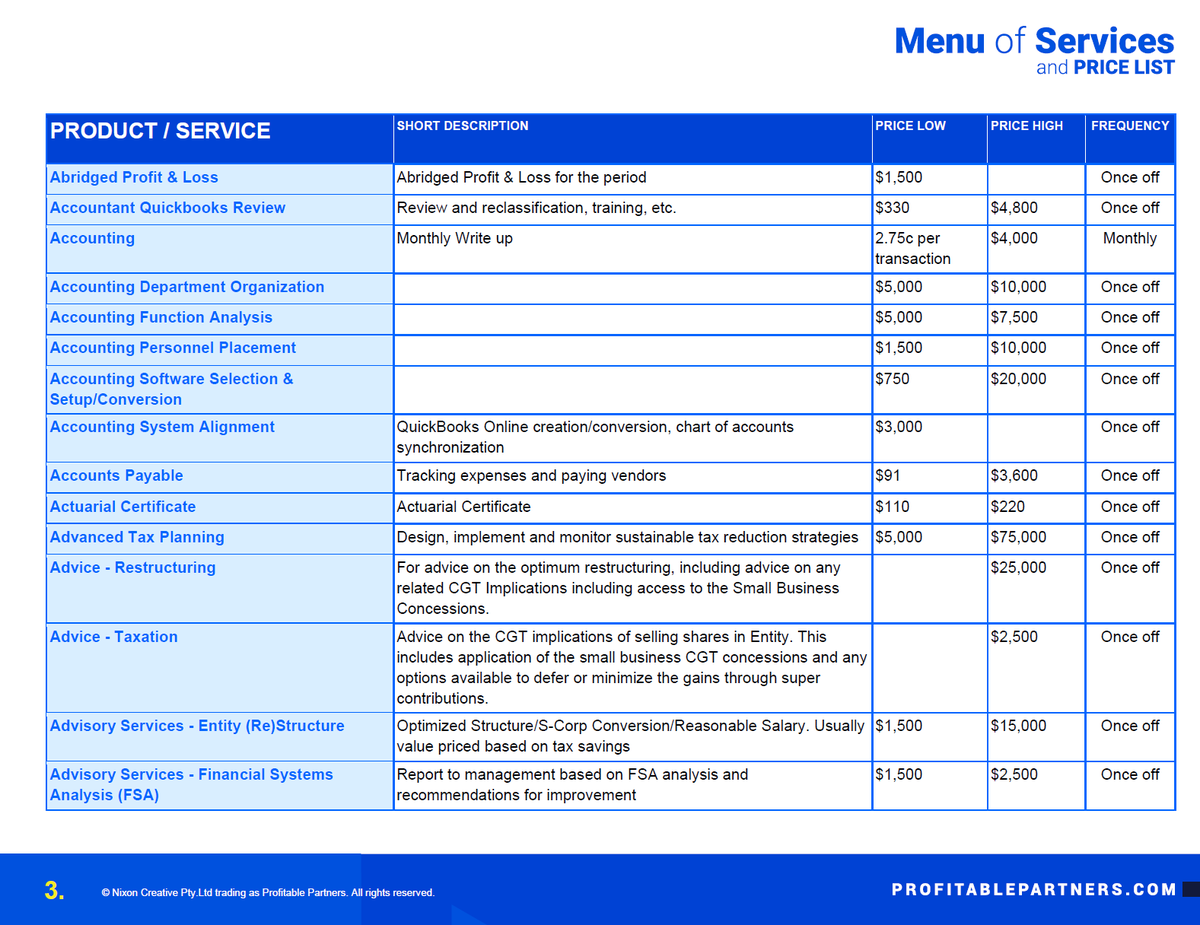 What do other Accounting firms charge for their services? Get the Menu of services - a comprehensive list of low and high prices for 429 services https://www.robnixon.com/menu-of-services/ …pic.twitter.com/7Xca5tkVyW