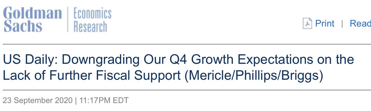 GOLDMAN: “We think it is now clear that Congress will not attach additional fiscal stimulus to the continuing resolution. ... We are lowering our Q4 GDP growth forecast from 6% to 3% on a quarterly annualized basis ..”pic.twitter.com/KybgsThDoN