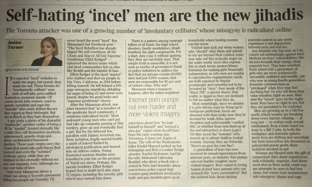 End of week take on #incel that is more sympathetic than most, although headline doesn’t do it any favours? The definitive article still has yet to be written. Perhaps I should step up? It needs proper access. All this comment stuff too arms lengthpic.twitter.com/mRPMNhCHVS
