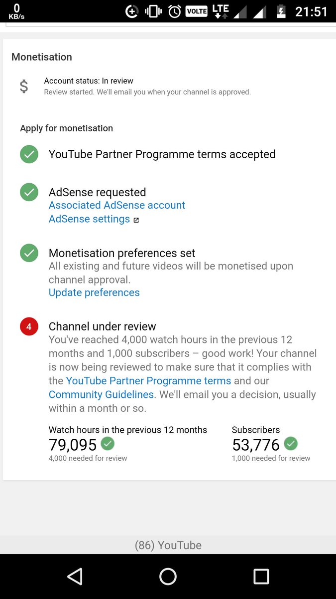 @TeamYouTube @YouTube @YTCreators @YouTubeIndia Sir My channel has reached 79k+ watch time and 53k+ subscribers. My channel is in under re-review from last month. My channel has no copyright & community strike and claim. When will my channel get monetized? https://www.youtube.com/MPYuva pic.twitter.com/W6SdzN7UAF