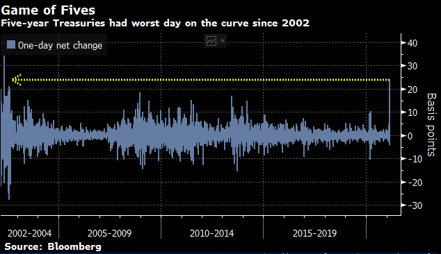 Just how bad was yesterday for 5-year Treasuries? Using the 2Y-5Y-10Y butterfly spread, it was the worst day since 2002