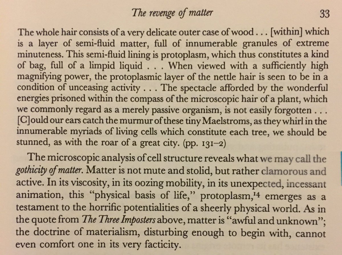 Hurley is particularly interested here with the make-up of the human body with a chaos of smaller organisms. The anxiety of the fin-de-siècle Gothic is that even the human body can be reduced to a base matter of slime.