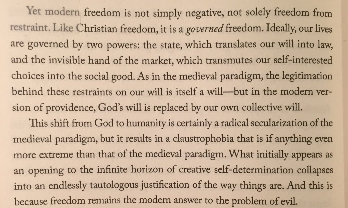 The concept of freedom, secularised from its religious roots, functions as a mechanism for blame. If we are “free” we are solely responsible for our actions. Not god, the state, or society, but the erring individual is seen as the source of sin. Adam Kotsko:pic.twitter.com/9YcqjYe3RE