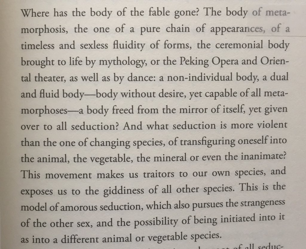 The joys of metamorphosis: becoming other than oneself; moving beyond old territories; finding new forms; giving oneself up to that which is outside. Joys now only dimly remembered in myth. Baudrillard:pic.twitter.com/4rQGBOFqcc