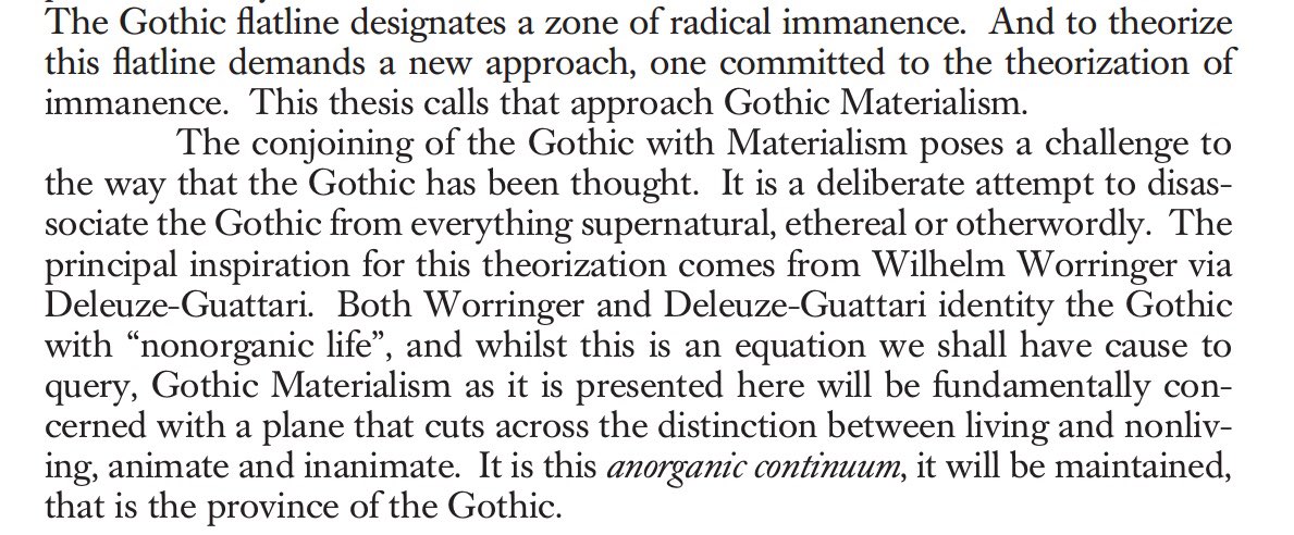 Against the postmodern (which never surpasses its Enlightenment roots), the Gothic charts an escape from humanist forms of aesthetics. At its core is not the human-centred sublime of Kant, but the inhuman abstract of Worringer and Deleuze. An art without a human agent. Fisher:pic.twitter.com/xvUJirXb4i