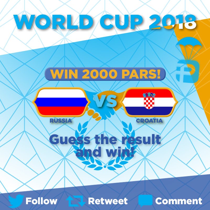#WORLDCUP GIVEAWAY! Question:#Russia vs#Croatia what will the final score be? Reward: 2000 Pars for the 1st person with the correct prediction 200 Pars for the 1st 5 who predict who qualifies How to Play: 1#Follow 2#Retweet 3#Comment before game starts#RUSCRO#RUS#CROpic.twitter.com/cDNmHa186p