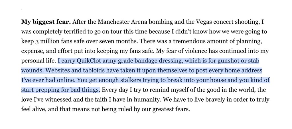 Taylor Swift: “I carry QuikClot army grade bandage dressing, which is for gunshot or stab wounds” https://www.elle.com/culture/celebrities/a26628467/taylor-swift-30th-birthday-lessons/ …pic.twitter.com/2dsCqel8x2