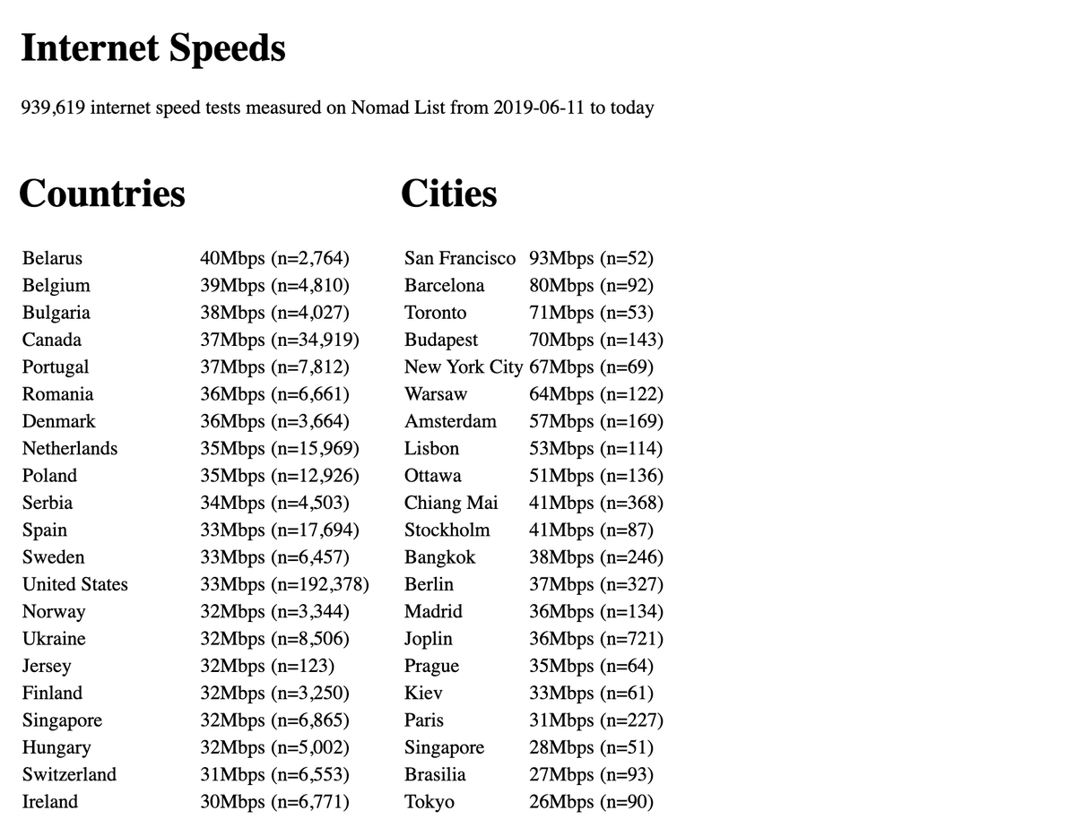 ✨ A few months ago I built my own internet speed tester on Nomad List. Now 939,737 speed tests later, I finally have my own live data set of internet speed data for countries and cities around the world: https://nomadlist.com/internet-speeds pic.twitter.com/ACtkkpVc9H