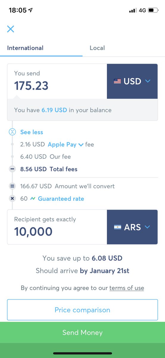 Sending 10,000 Argentinian pesos will cost you: $139 with @WesternUnion $175 with @TransferWise TransferWise is 25% more expensive, because their exchange rate is 1:60 vs 1:81pic.twitter.com/KFr8Zd21bP