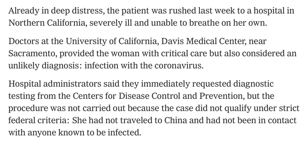 The very strict coronavirus test criteria in the United States seem to slow down detection of early cases, like this California patient https://www.nytimes.com/2020/02/27/health/coronavirus-testing-california.html …pic.twitter.com/ODcv11jdhk