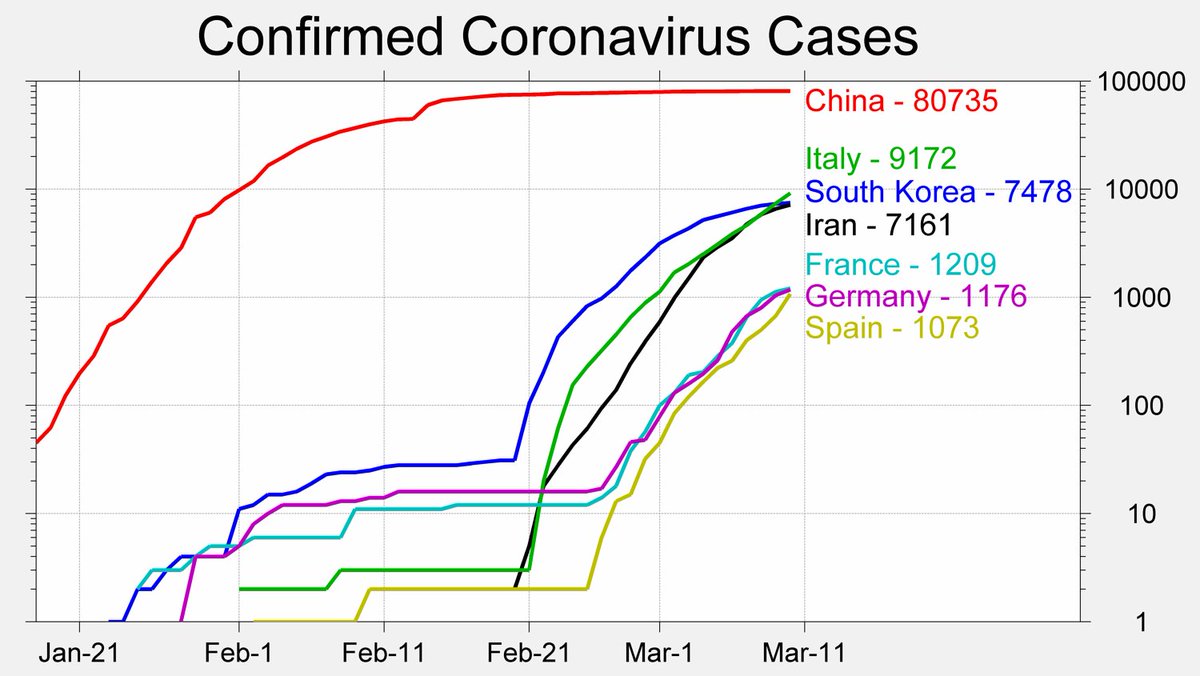 Seven countries have now reported more than 1,000 cases of the coronavirus, with the new addition of Spain. Italy has continued their surge, adding 1,797 cases since yesterday, but they also announced that the whole country has been put on lockdown. Logarithmic scale. pic.twitter.com/7N1wMMgeSG