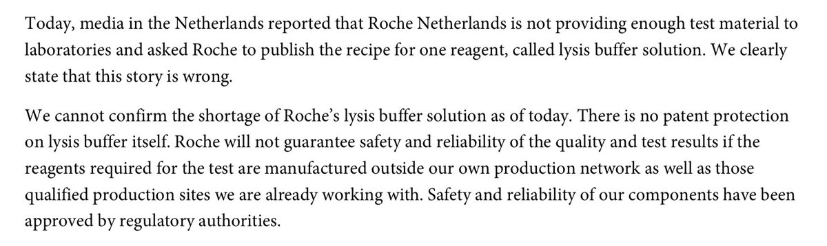 Deze verklaring is wel heel economisch met de waarheid. (1) De labs in Nederland kunnen het zeker zelf maken, maar met het Roche recept zou het veel sneller gaan. (2) Als er geen tekort is, kunnen ze dat makkelijk bewijzen door gewoon te leveren.pic.twitter.com/ajcxVOkt3h