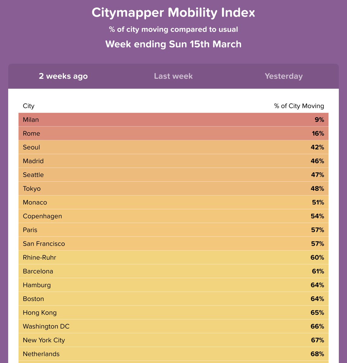 Het aantal Citymapper gebruikers dat in Nederland reist is wel drastisch afgenomen in de laatste twee weken: 68% → 12% → 7% https://citymapper.com/cmi pic.twitter.com/mTtdM8ttQ2