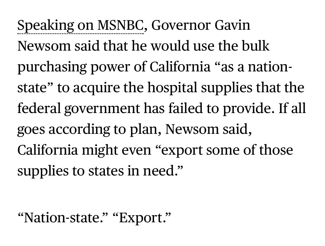It has been super interesting to see Governor Newsom refer to California as a “nation state” for a while now https://www.bloomberg.com/opinion/articles/2020-04-09/california-declares-independence-from-trump-s-coronavirus-plans …pic.twitter.com/EfsVCWUQBk