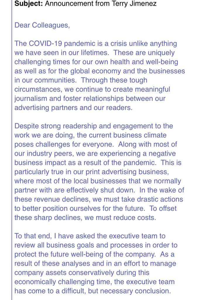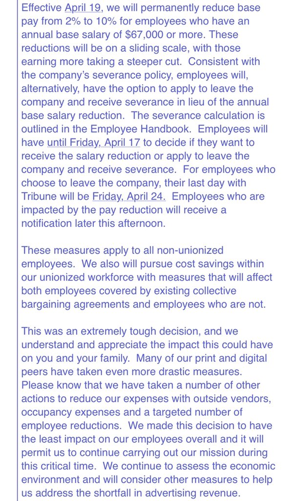 Tribune Publishing CEO Terry Jiminez announces pay cuts on sliding scale for those making more than $67k - invites those who don’t want cuts to apply to leave w severance. Execs generous pay cut too.