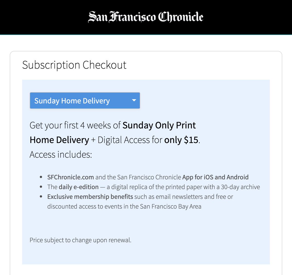 I’m very close to subscribing to the @sfchronicle but why is the checkout flow so bad. Like, sure, it’s $15 for the first 4 weeks, but how much is it afterward? “Subject to change upon renewal”  https://subscription.sfchronicle.com/checkout/120/2 pic.twitter.com/2JRfiSZfBF