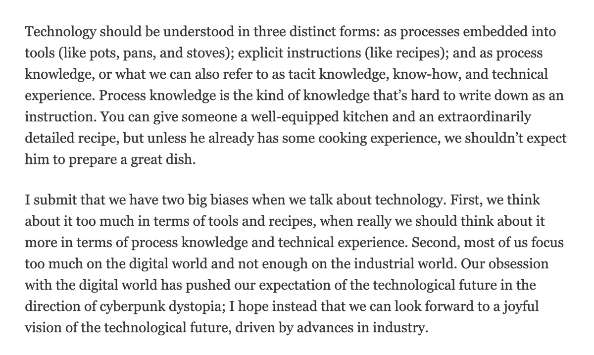 “Technology should be understood in three distinct forms: (1) as processes embedded into tools (like pots, pans, and stoves); (2) explicit instructions (like recipes); (3) and as process knowledge, or what we can also refer to as know-how and technical experience.”pic.twitter.com/at0iDuDEpX
