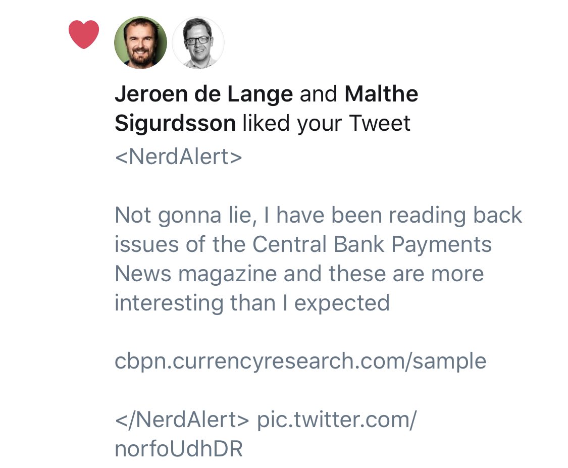 <NerdAlert> Not gonna lie, I have been reading back issues of the Central Bank Payments News magazine and these are more interesting than I expected https://cbpn.currencyresearch.com/sample </NerdAlert>pic.twitter.com/norfoUdhDR