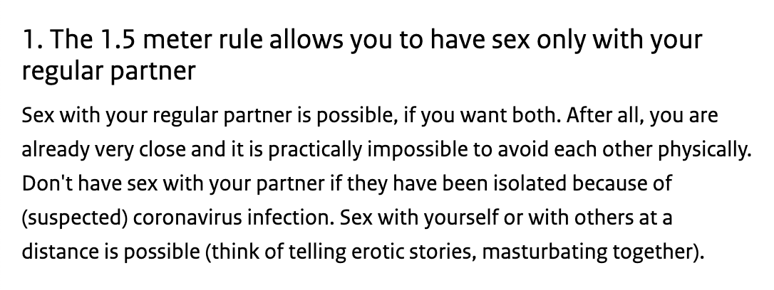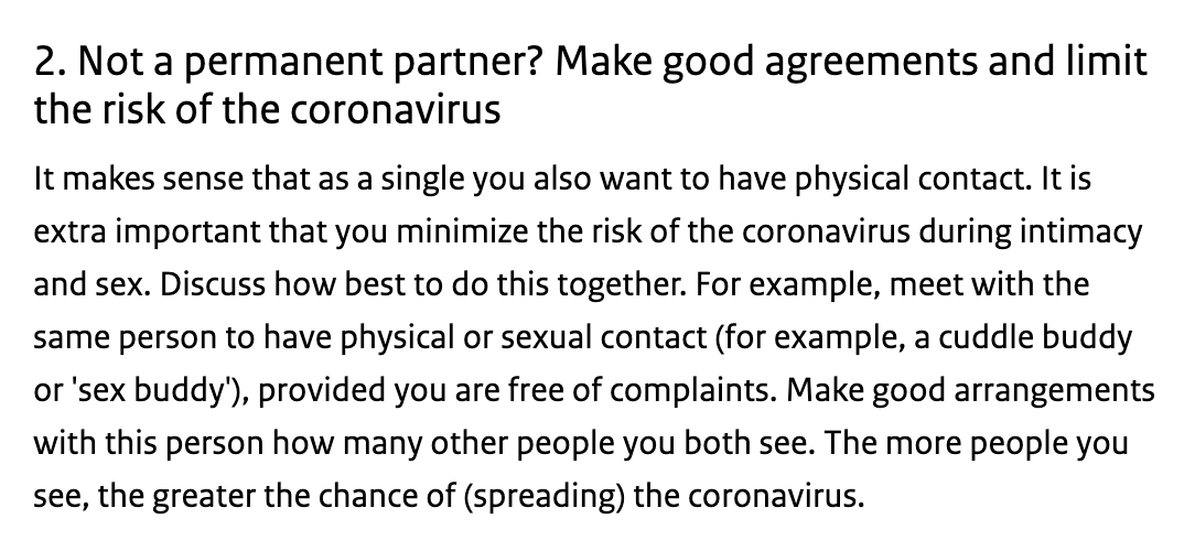 “Sex with yourself or with others at a distance is possible (think of telling erotic stories, masturbating together)” “It makes sense that as a single you also want to have physical contact. Make arrangements with this person how many other people you both see” https://twitter.com/kalltvatten/status/1260970745510887428 …pic.twitter.com/Pr9lKKaG8A