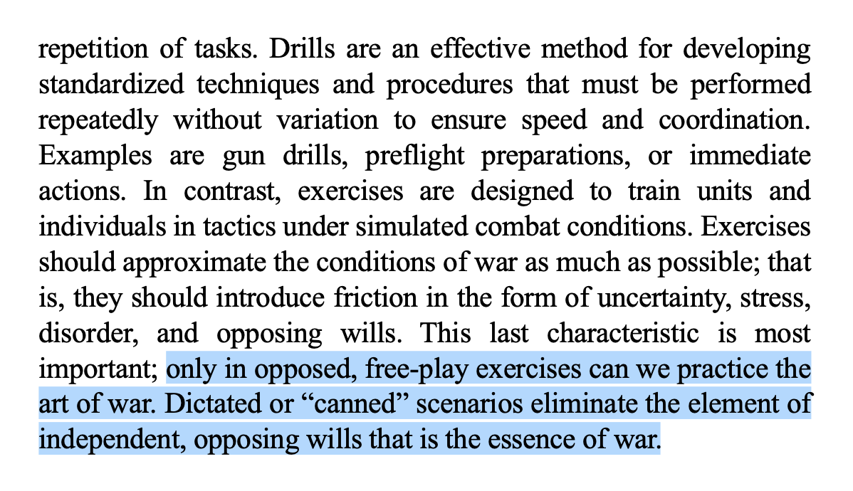 “Only in opposed, free-play exercises can we practice the art of war. Dictated or ‘canned’ scenarios eliminate the element of independent, opposing wills that is the essence of war.” https://www.marines.mil/portals/1/Publications/MCDP%201%20Warfighting%20GN.pdf …pic.twitter.com/pUczIEoR0h