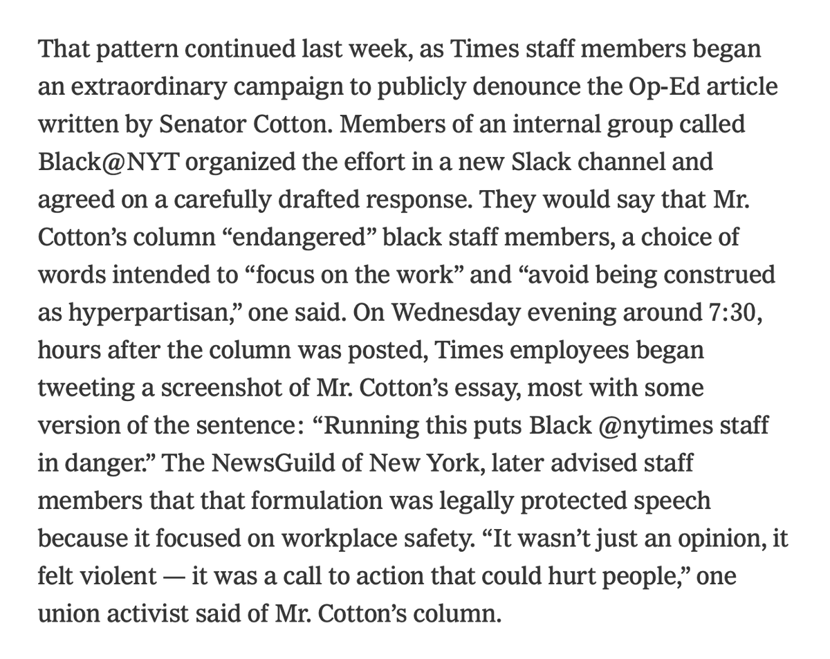 “‘Running this puts Black NYT staff in danger.’ The NewsGuild of New York, later advised staff members that that formulation was legally protected speech because it focused on workplace safety” https://www.nytimes.com/2020/06/07/business/media/new-york-times-washington-post-protests.html …pic.twitter.com/Inz57JgVvi