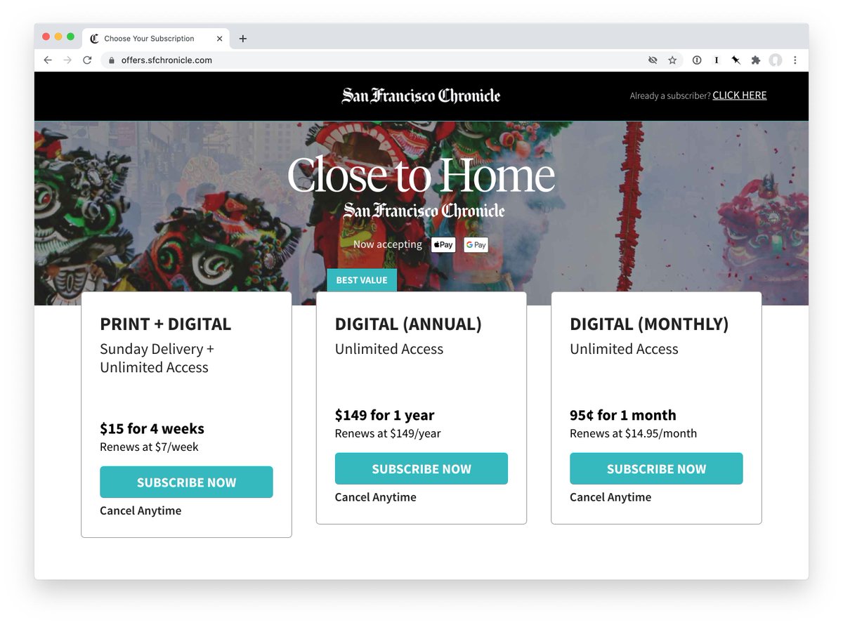 Newspapers are in a tough market and we should support them, but they also suck at selling themselves. I have looked at this subscription page multiple times and still don’t understand what the Print+Digital option gives me. What does “Sunday Delivery” mean?pic.twitter.com/9G30jAdaes