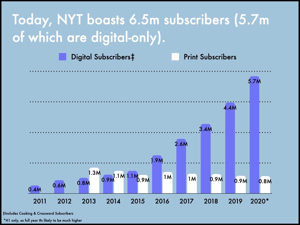 The NYT used to be an advertising business, but no more. It’s has been much more successful than competitors in growing its subscriber basepic.twitter.com/IunWxaMv7a