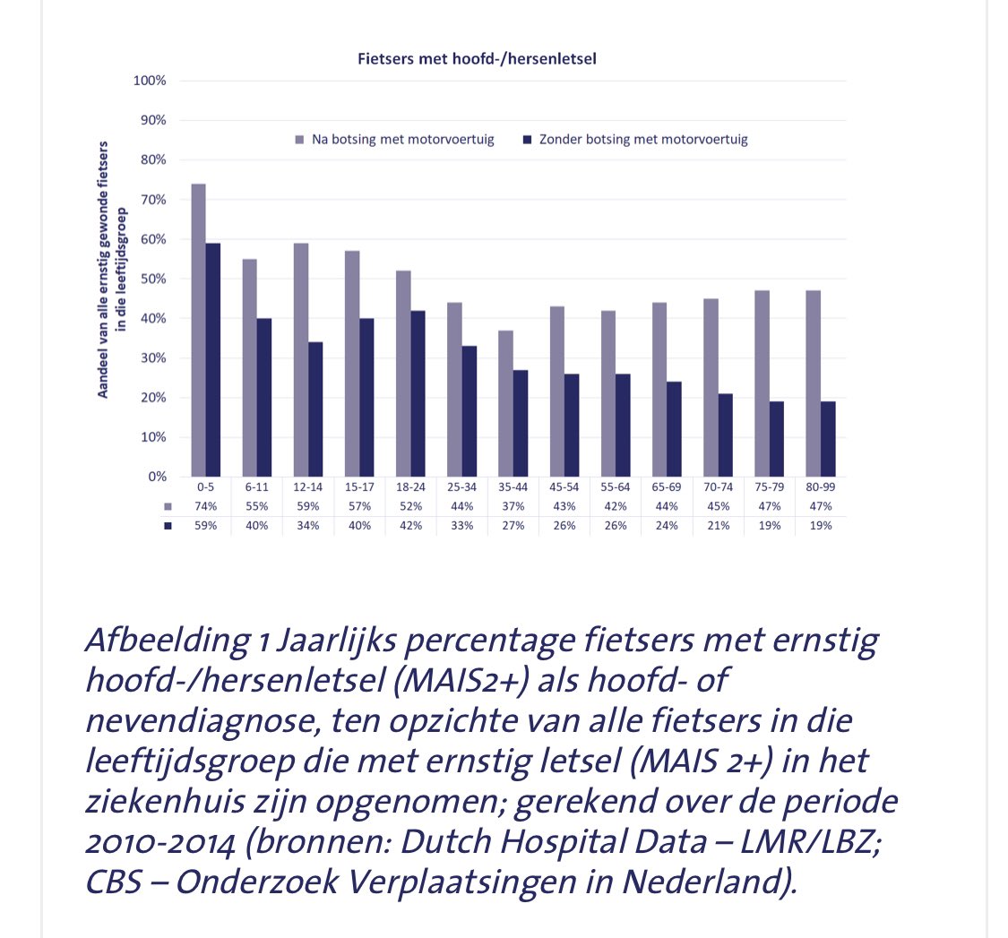 Bij fietsongevallen waarbij een motorvoertuig betrokken is, loopt bijna de helft van de fietsers hoofd- of hersenletsel op (47%); bij fietsongevallen zonder motorvoertuig geldt dat voor ruim een kwart (28%) https://www.swov.nl/feiten-cijfers/factsheet/fietshelmen …