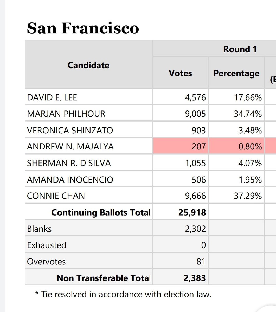 progressive @conniechansf winning by a slim lead of 57 votes against @MarjanPhilhour, the mayor's former senior advisor, in the Richmond District (District 1)