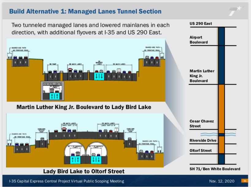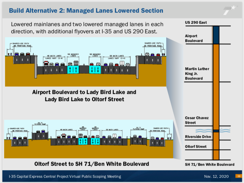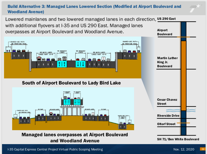 Anyway, I am burying the lede: Here are the three proposed designs for an expanded I-35 through downtown Austin. The first has 20 lanes. The other two have 19. For comparison, the downtown stretch of I-35 currently has 12 lanes. That’s *a lot* more highway. pic.twitter.com/rXT8HBfhvT