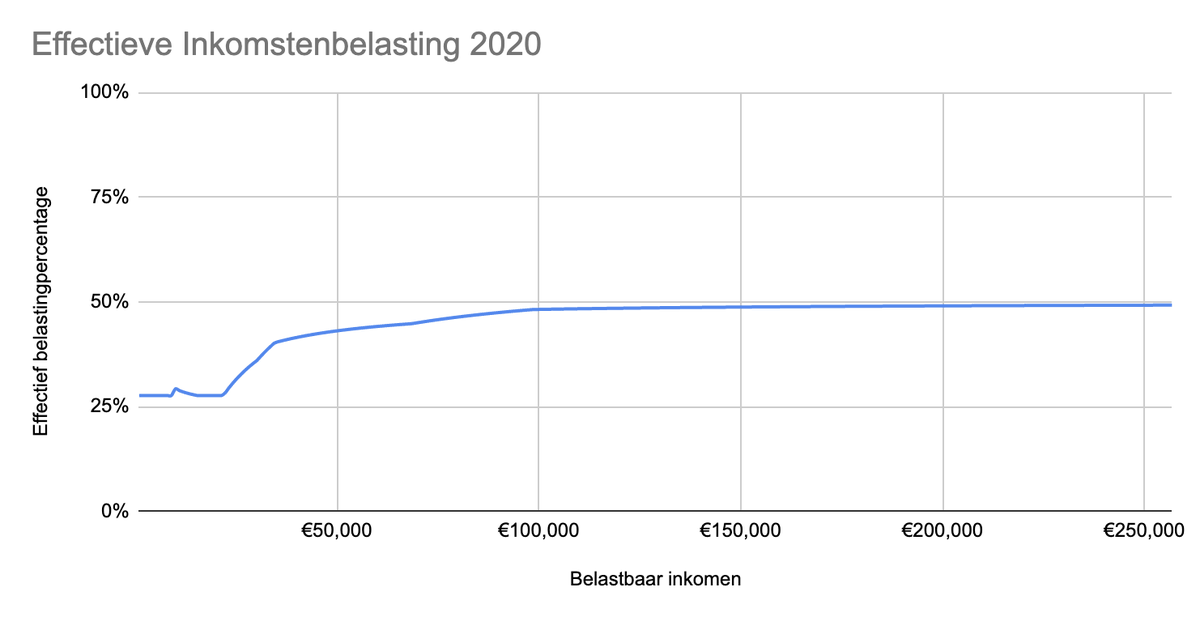 Ik kon geen overzicht vinden van de effectieve inkomstenbelasting, dus heb er zelf eentje gemaakt. Zitten misschien nog wat fouten in, maar twee dingen vallen op: 1. Zo progressief is het niet 2. Tussen €10-15k inkomen zit een gekke hobbel in de arbeidskorting?pic.twitter.com/fKOpzAZvVt