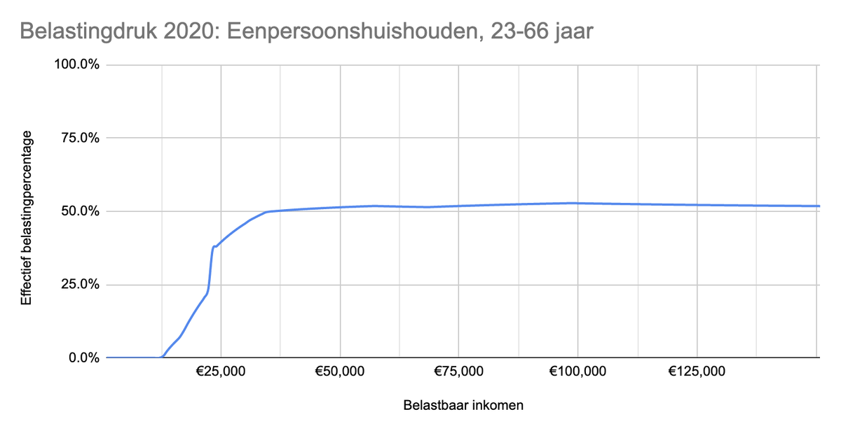 Nu de belastingdruk inclusief de maximale zorg- en huurtoeslag voor een eenpersoonshuishouden tussen de 23 en 66 jaar: - Geen belasting met een inkomen onder €12.500 - 50% belasting bij meer dan €35.000 aan inkomen Zie ook de spreadsheet: https://docs.google.com/spreadsheets/d/10LbyxgXOBGVI_E9X3NtKPMfILSD9W0k_kYeEQuJfIco/ …pic.twitter.com/k0aw7ZJMwG