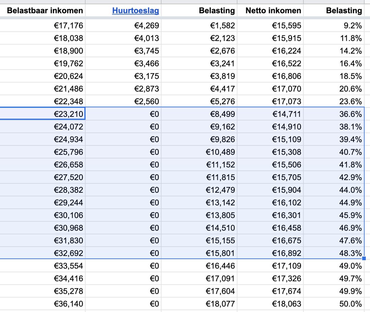 De huurtoeslag heeft sinds dit jaar geen abrupt eind meer, dus die berekening heb ik aangepast. Daarmee is ook de hobbel van de arbeidskorting weggewerkt. De marginale druk tussen de €20k en de €35k ligt (in mijn berekening) nog steeds erg hoog https://docs.google.com/spreadsheets/d/10LbyxgXOBGVI_E9X3NtKPMfILSD9W0k_kYeEQuJfIco/edit#gid=0 …pic.twitter.com/KhE1QM9Dzm