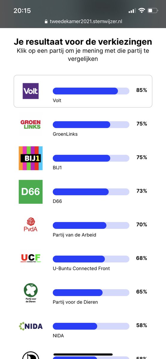 Ja dat is zijn zeker hoge scores. Ik had een vergelijkbare lijst. Daar wel gezien dat je echt in de antwoorden moet duiken. Mijn 'ja' was ook een 'ja' voor hoog matchende partij maar we gingen in onze uitleg compleet de andere kant op.