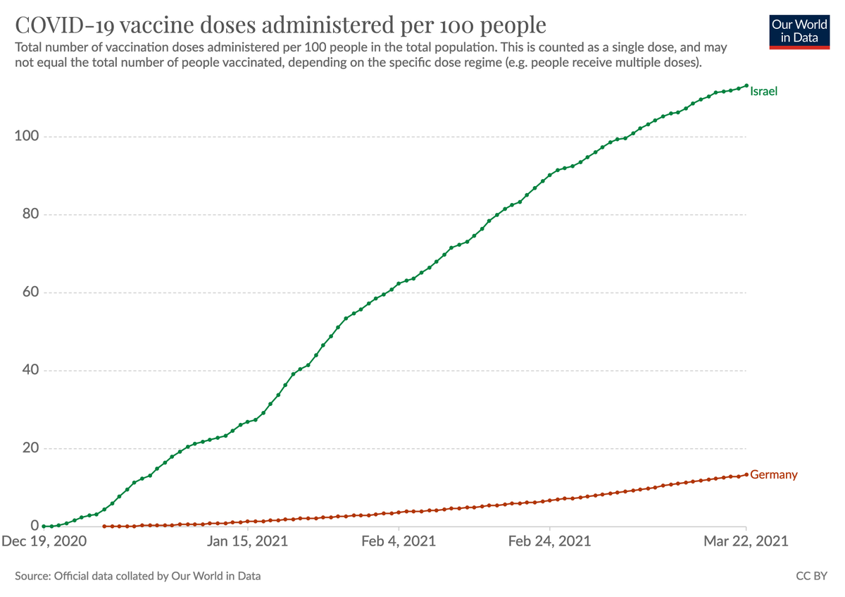13 vaccinations per 100 people. Germany is now in their vaccination campaign where Israel was on the 3rd of January.pic.twitter.com/iITBL10ZtH