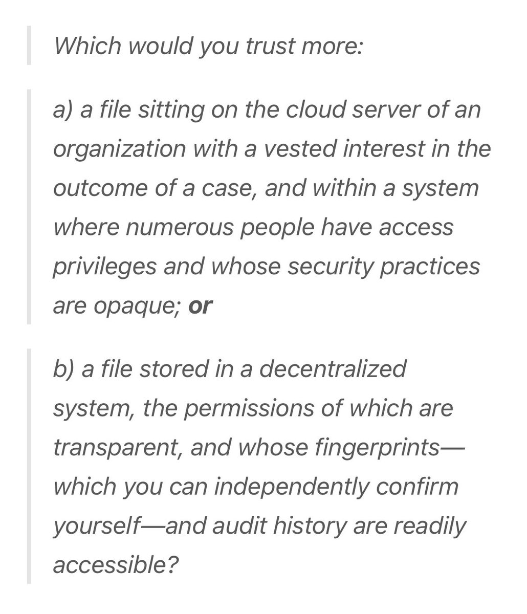 Volgens mij weerlegt hij zijn eigen thesis: Als je de cloud server van de camerafabrikant niet vertrouwt, waarom vertrouw je de blockchain registratie door diezelfde camerafabrikant wel?pic.twitter.com/Pyhauu1NKL