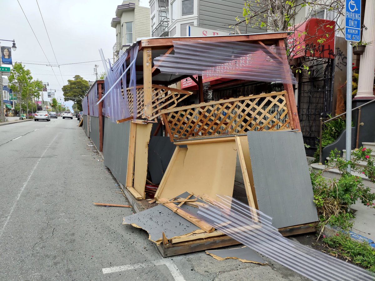I'm mad right now. While on Divis this morning I saw the the outdoor dining space set up by Horsefeather on Divis has been struck by a car. @DeanPreston will you push SFMTA to establish a transit-only lane on Divis, to prioritize room for buses driven by trained operators?pic.twitter.com/NpA6v4ue5N