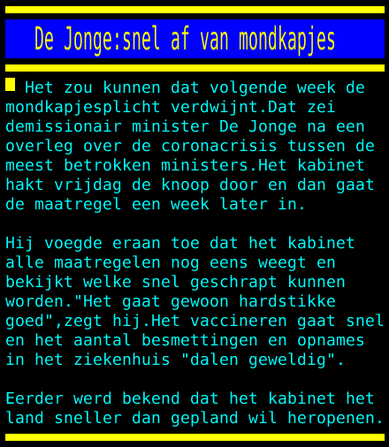 De Jonge:snel af van mondkapjes pic.twitter.com/PHG6vTbxFf