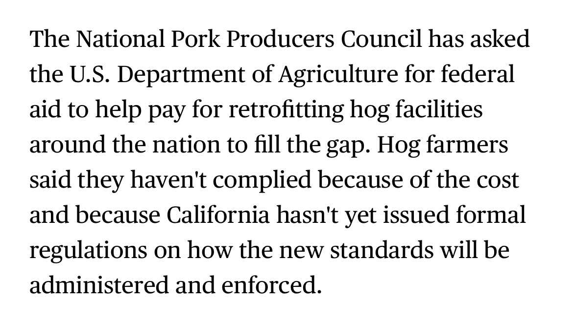 California raising the regulatory bar for America is good (animal welfare, privacy, etc), but it is weird it takes them 2+ years to publish their standards https://www.bloomberg.com/news/articles/2021-07-31/bacon-may-disappear-in-california-as-pig-rules-take-effect …pic.twitter.com/REKP1SlLlL