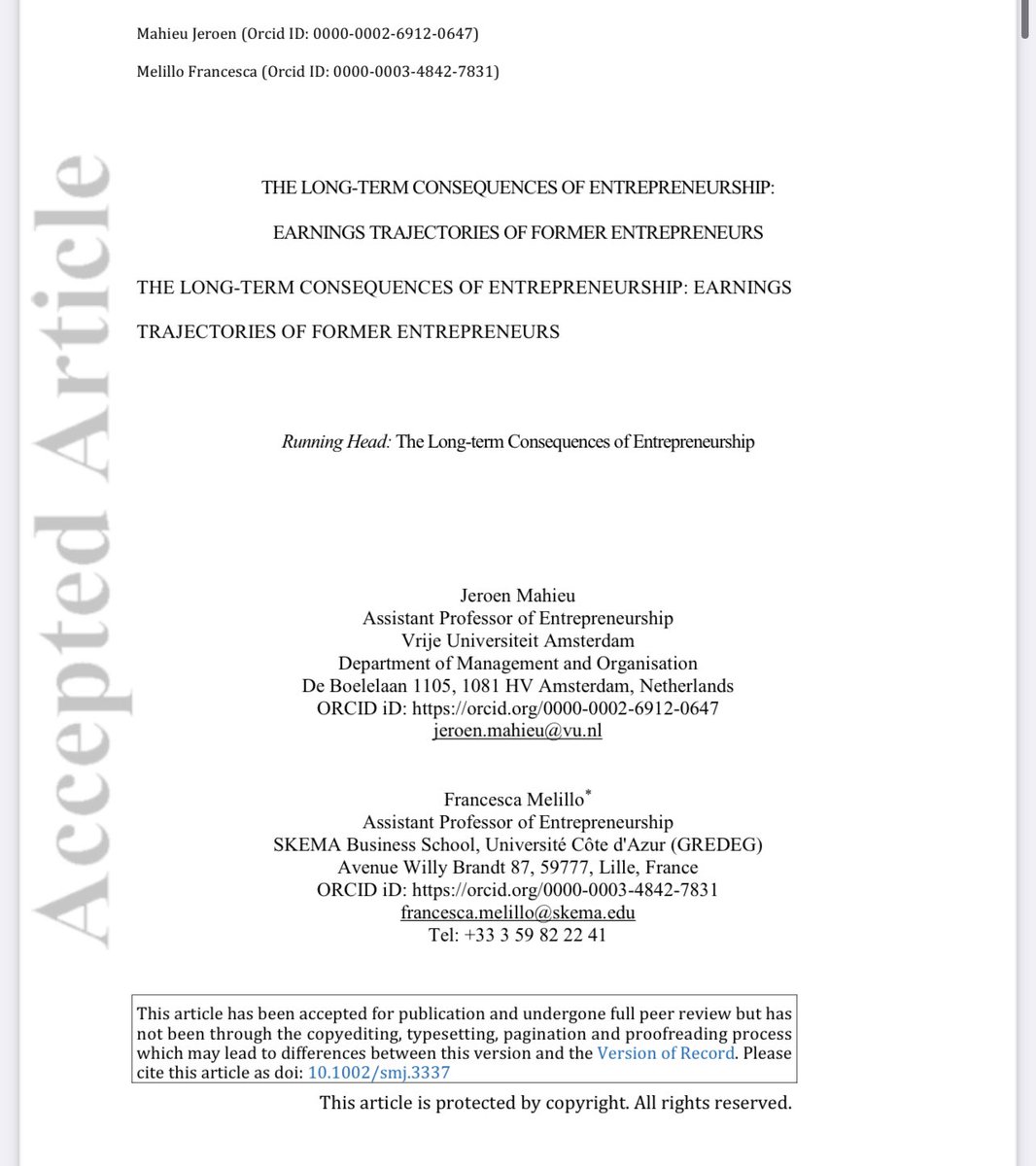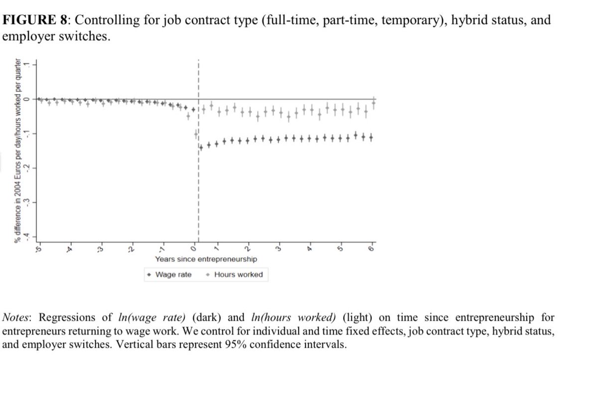 More evidence that ex-entrepreneurs take a long-term hit to earnings, this time from Belgium. Five years after going back to work, they earn 27% less than others, though 60% of the gap is because former founders work less hours by choice though the reason for that is unclear.pic.twitter.com/1kXwjL6NaE