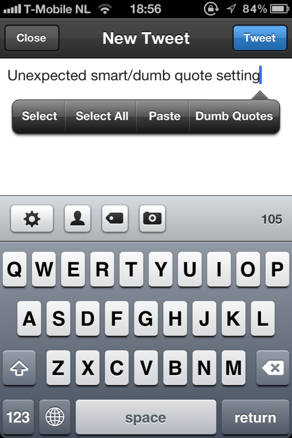 @tweetbot Unexpected place for the smart/dumb quote setting, messes with my muscle memorypic.twitter.com/62JNavAr