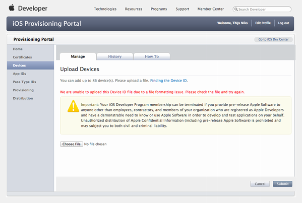@testflightapp Apple’s provisioning portal doesn't accept my device export files from Testflight anymore. Bug?pic.twitter.com/uWos1SSg
