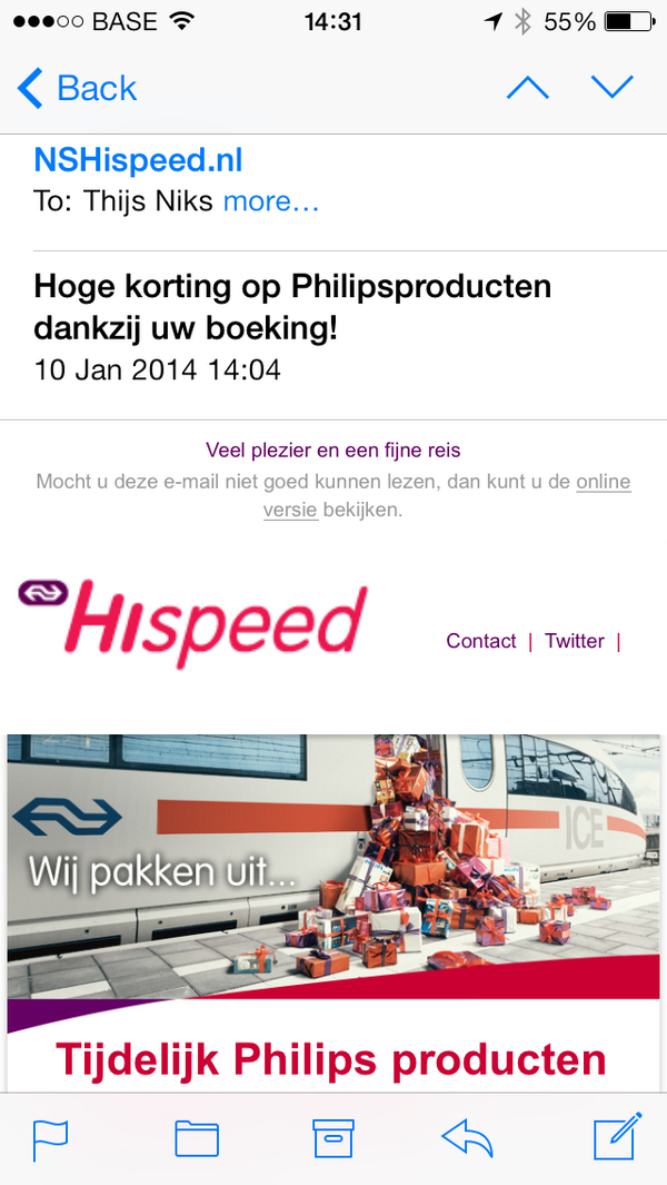 Net kaartjes geboekt bij @NSHispeed. Ben benieuwd of ik nu ook @Philips-spam ontvang. Spannend hoor.